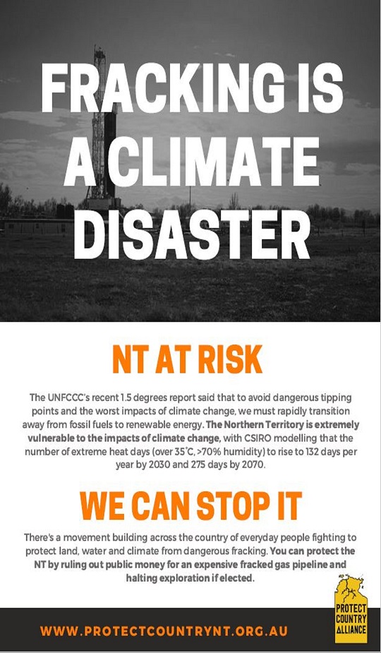 Want a handy document that highlights the risk that fracking the NT poses to our climate? Ideal for market stalls or meeting with your local politician. Click here to download.